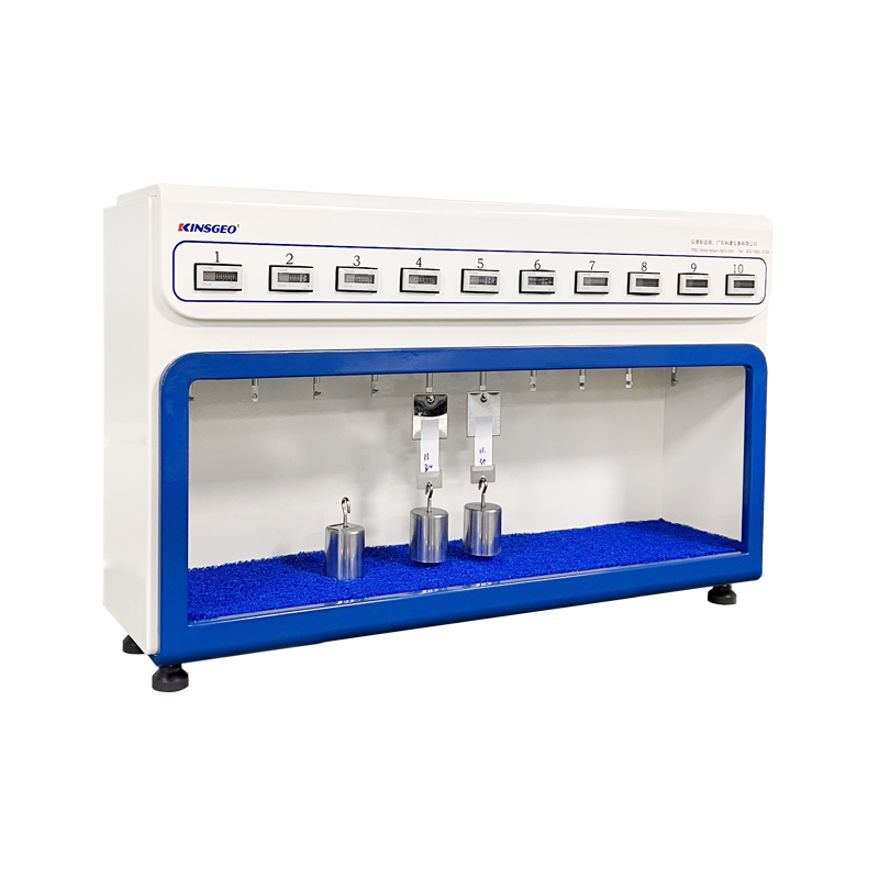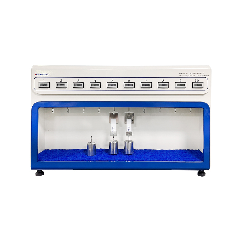 KJ-6010常溫型膠帶保持力試驗機針對膠帶的粘著力做靜太負荷試驗,在一定的荷重下自動記錄膠帶所能保持的時間,以確認膠帶粘著的時效。裁1英寸寬的長條狀膠帶貼于規定的SUS#304不銹鋼板上,經2kg的標準滾輪以每分鐘300mm的速度來回碾壓三次,將鋼板掛于試驗機上,加上規定的砝碼,當膠帶自鋼板上掉落后,計時器會自動保留試驗時間,用來評定膠帶粘著的持久性。該膠帶保持力試驗機廣泛應用于:膠粘帶,保護膜,不干膠,標簽,泡棉,膠粘劑等膠粘制品行業,具有試件掉落時間自動記憶功能,無需操作人員在試驗過程中進行監控;結構美觀大方,操作方便。